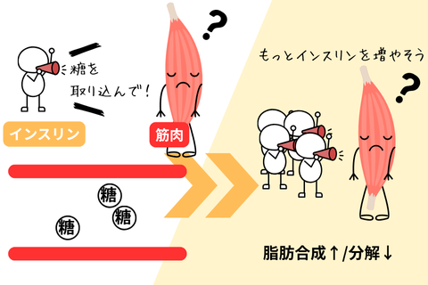 インスリンには「脂肪の合成を促し分解を止める」という働きもあるため、「常時インスリンが居座っている体=太りやすく痩せにくい体」になると言えます。