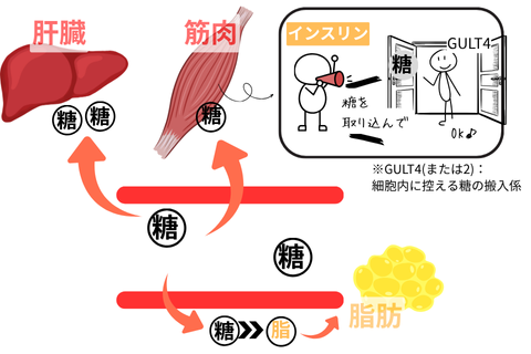 ✅ 余った糖は脂肪に作り変えて脂肪細胞に貯める。