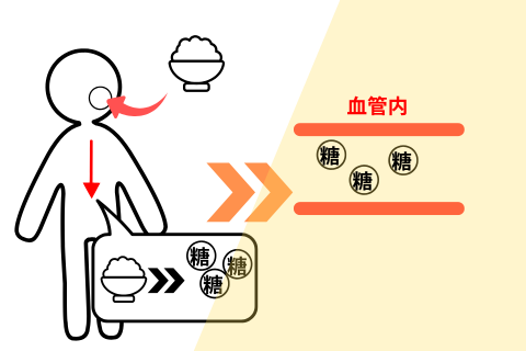 ご飯やパンなど、糖質を含む食べ物を食べると、腸でブドウ糖に分解されて血液に入ります。
