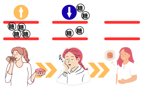 しかし、『ドカ食い』や『砂糖などの吸収の早い糖を摂る』と血糖値が急激に上がります。
