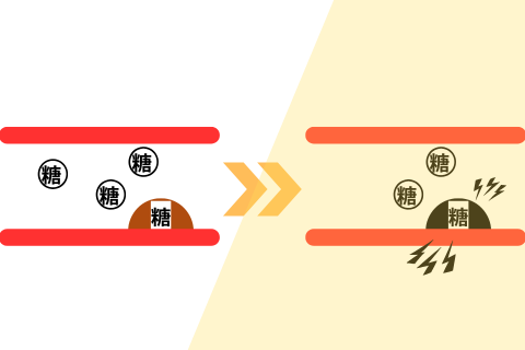 すると余った糖は、血管のタンパク質と結びついて『糖化』という現象が起こります。(糖が血管内で焦げるイメージ)