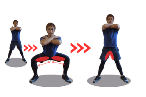 - 姿勢を崩さず、膝・股関節を曲げ、内腿に伸びを感じながらしゃがむ