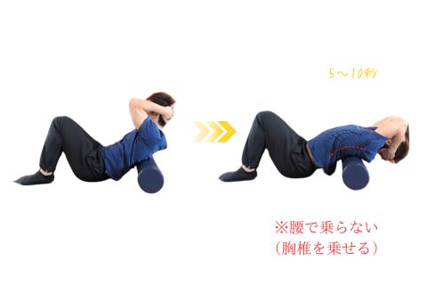 - ストレッチポールに背骨(胸椎部)をつけ仰向け、頭の後ろで手を組む