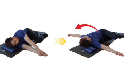 - 天井側の腕を後ろに動かし、胸を開いて上半身を後ろへ捻る