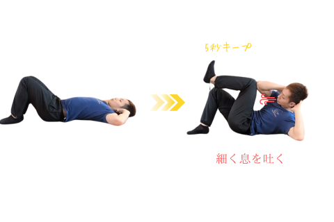 - 両膝を曲げて仰向け。両手は頭の後ろへ