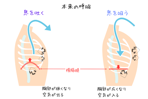 本来の深い呼吸では、横隔膜(おうかくまく)をはじめとする、”呼吸筋”が働くことで、”「胸郭」=背骨(胸椎)・肋骨・胸骨が作るカゴ”を広げ、肺に十分な酸素を送っています。