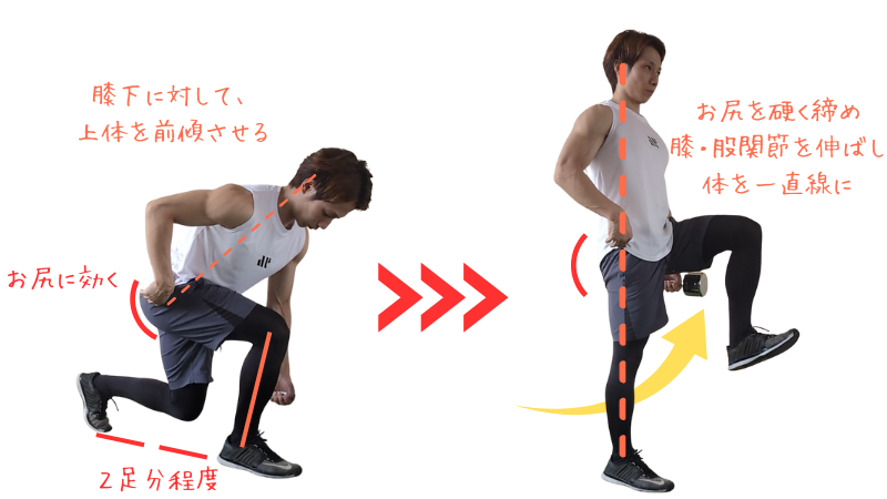 少し前傾姿勢で行うことで、より効果的にお尻の筋肉を使うことができます。