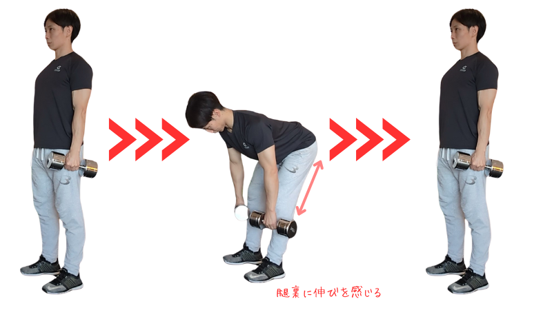 ヒップヒンジで上体を倒しダンベルをすねの近くまで下げる