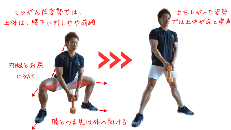 足幅は肩幅より広めで膝・つま先を外側へ向ける。両手で引っ掛けるように、体の前側でダンベルを持つ