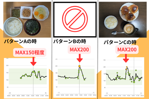 ✅️朝食を抜いたり、糖質中心の簡単な朝食では、昼食後の血糖値が急上昇しやすかった。